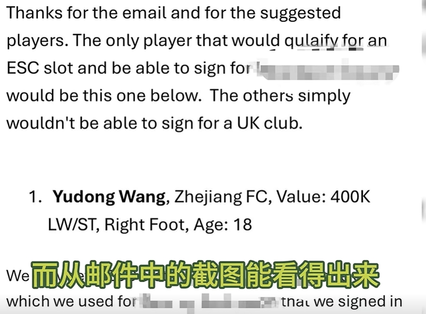 博主并未在视频中透露该俱乐部的名字,也在邮件关键信息中打上了码。但据博主的介绍,该俱乐部应该不会是英超俱乐部,很有可能是相对低级别的俱乐部。